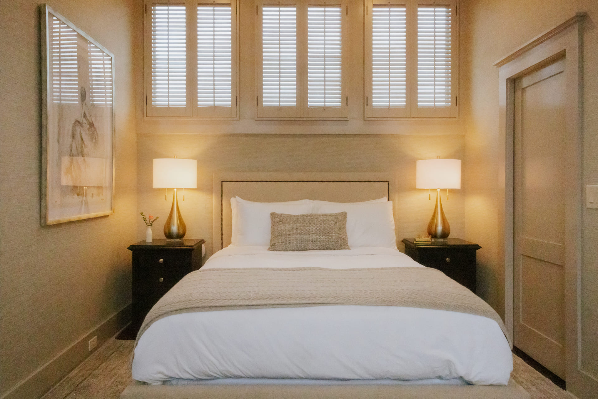An upstairs suite with natural light and peaceful views of the courtyard and fountain. A simple, comfortable space for a quiet stay.